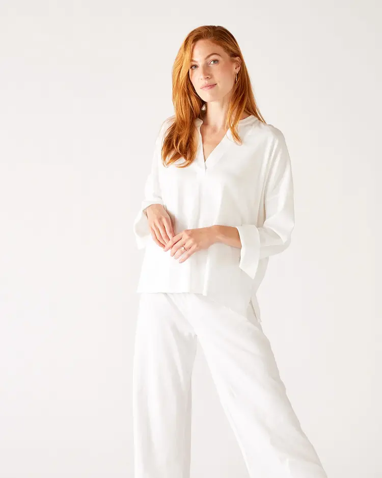 Our best-selling Amelia Cuff Tee OS is beloved for its effortless elegance and versatile design. Featuring a flattering V-neckline and tailored cuffs, this long sleeve tee can be dressed up or worn casually, making it perfect for cozy days at home or stylish outings with friends.