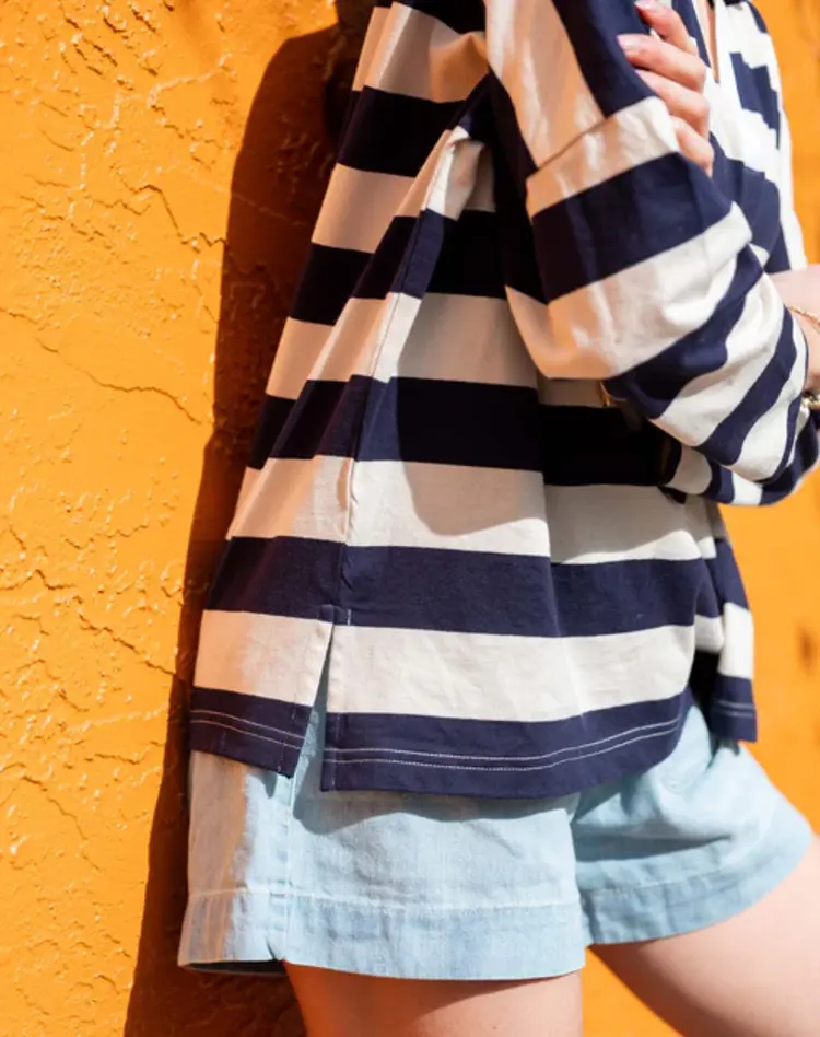 Designed with a collared v-neckline placket and bold rugby stripe pattern, the Amelia Rugby Tee blends casual ease with elevated charm—making it an ideal gift for active days, relaxed weekends, or layering through the seasons. Its small side slits, borrowed from the best-selling Amelia Tee, add comfort and shape, making this tee a gift that will be worn again and again.