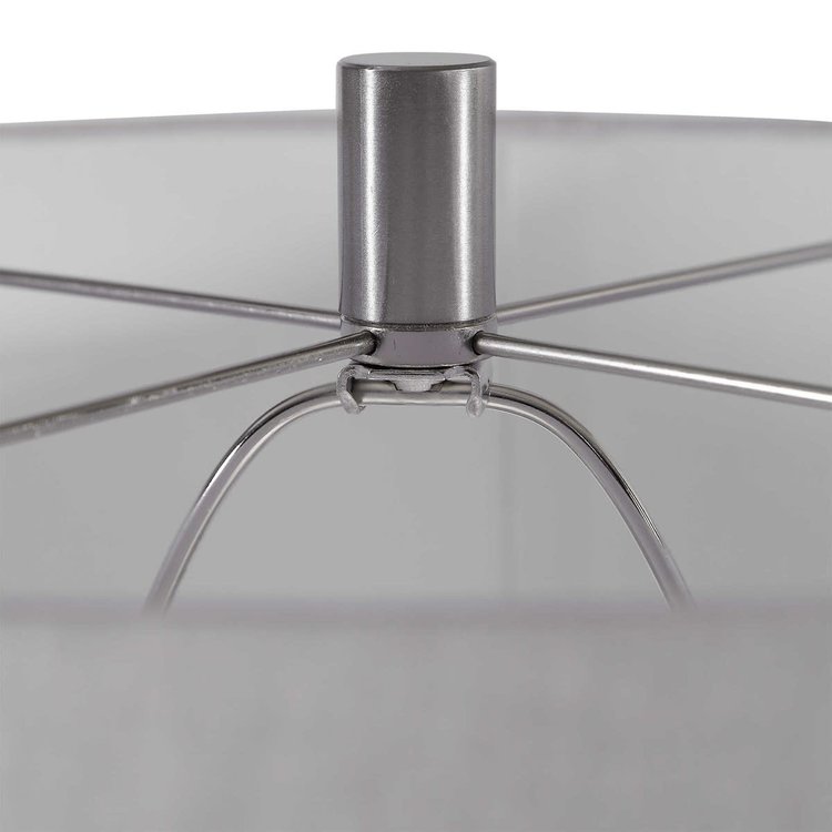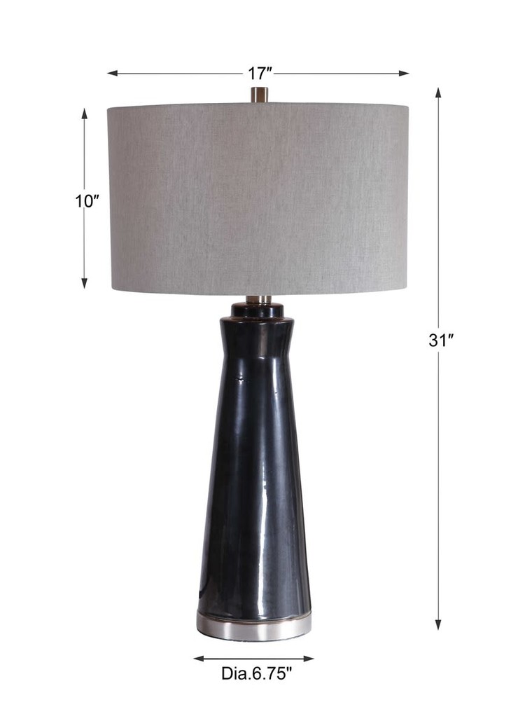• Contemporary in style, this ceramic table lamp is finished in a glossy dark charcoal glaze, accented with brushed nickel plated details.