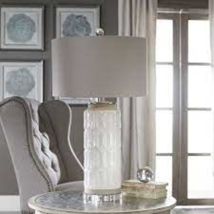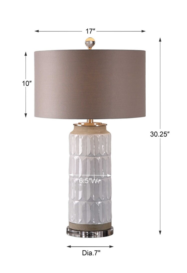 Embossed ceramic, finished in a lightly distressed gloss white glaze, with aged ceramic at top and bottom, accented with brushed nickel plated highlights and thick crystal details. The round hardback drum shade is a beige linen fabric. Due to the nature of fired glazes on ceramic lamps, finishes will vary slightly. *This item isn't covered by our shipping special, it is available for free pick-up in our West Seattle store. Please contact us directly if you wish to discuss possible shipping options or local delivery.
