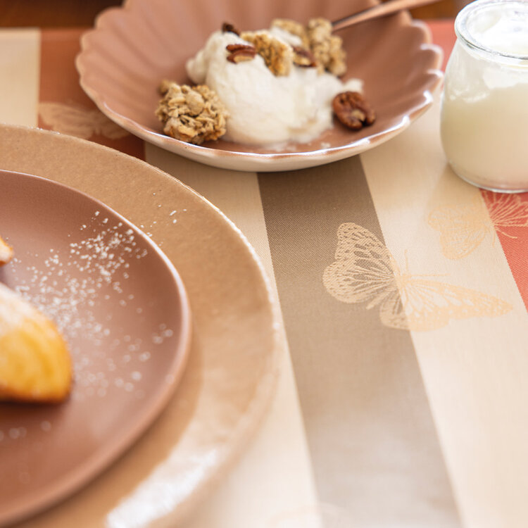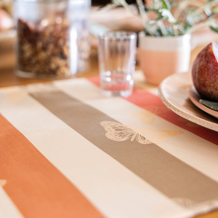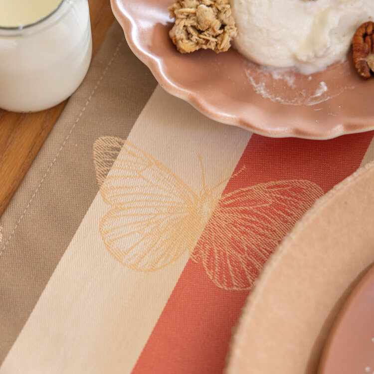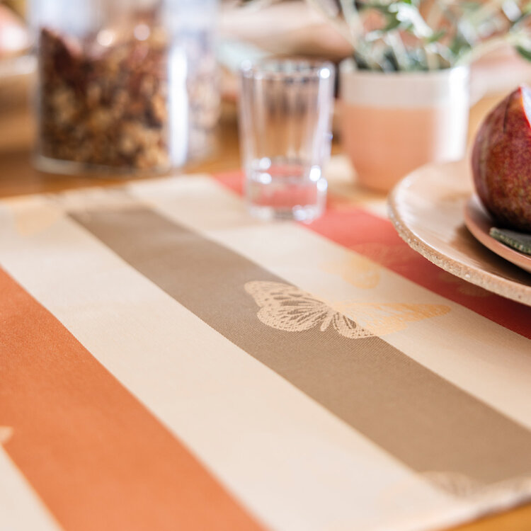 Inspired by the magic of nature, these pink-striped tablecloth transport you into an enchanting fairytale, where delicate butterflies dance through a whimsical garden scene. Effortlessly elegant, their soft hues and playful stripes add a touch of French charm to your table.