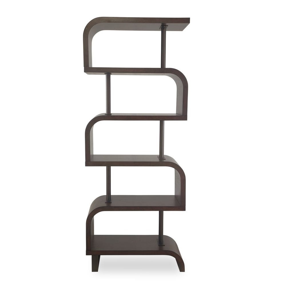 The Bia Etagere Chocolate is a striking statement piece of home decor that combines symmetry and contemporary elegance. Its rich chocolate mahogany veneer shelves provide a bold visual contrast, while the bronze posts add a refined metallic touch, making it a standout addition to any living space.