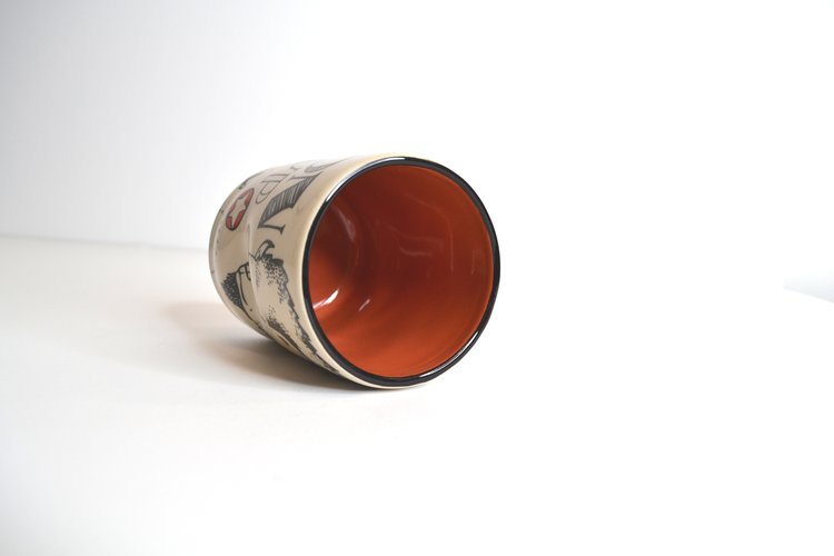 Like prints of a painting, the cups that make up the Lucky Cup Line are faithful reproductions of the artist's originals. Designed in Washington State, made in Thailand. The wares are food, microwave, and dishwasher safe, as well as family and cafe proven strong.