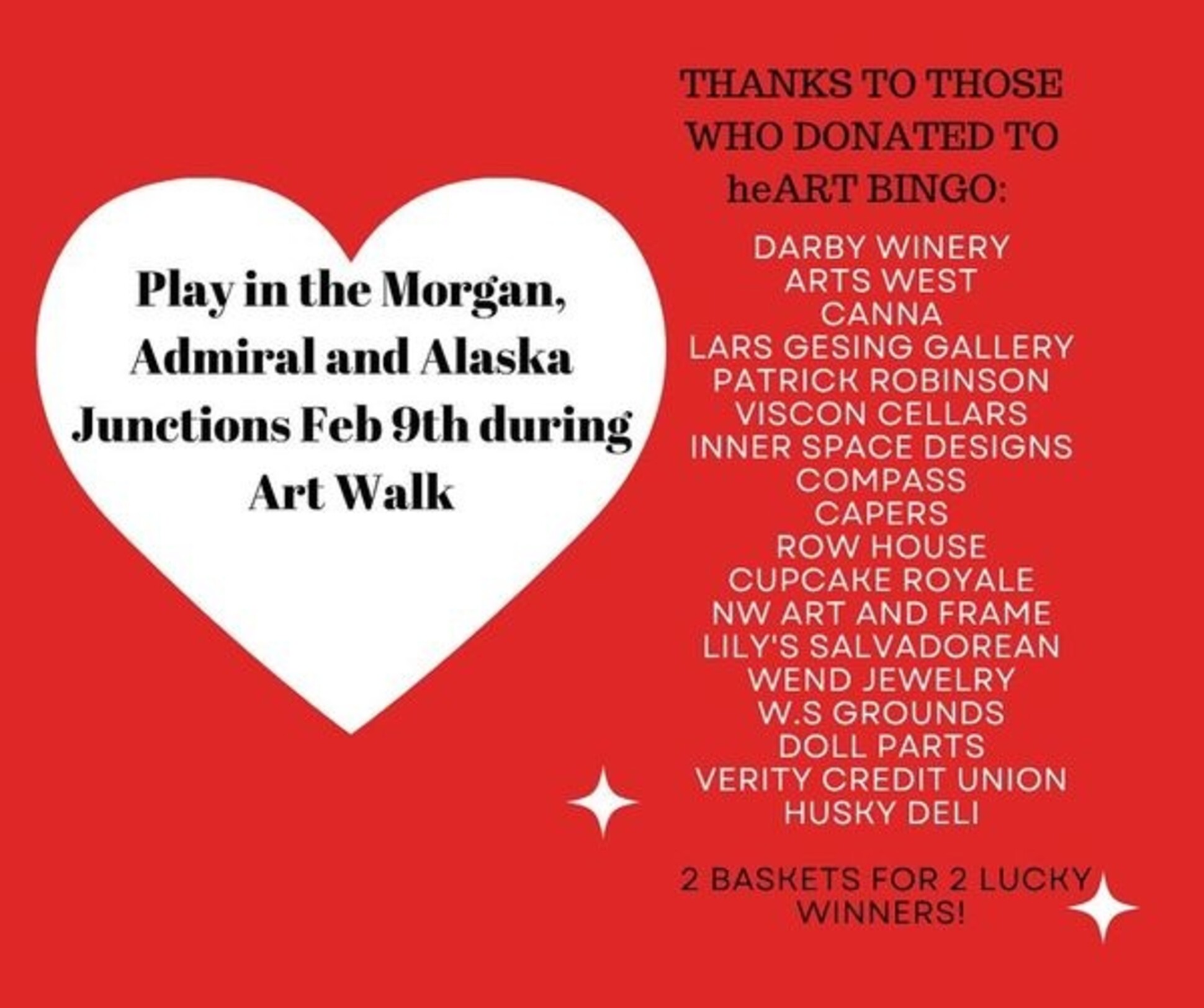 Come play heART Bingo on February 9th, for the chance to win one of two amazing gift baskets from these incredible merchants in West Seattle! Get your steps in, see some great art, earn a chance to win a prize! All participating merchants will have maps & more info. We hope to see you here!