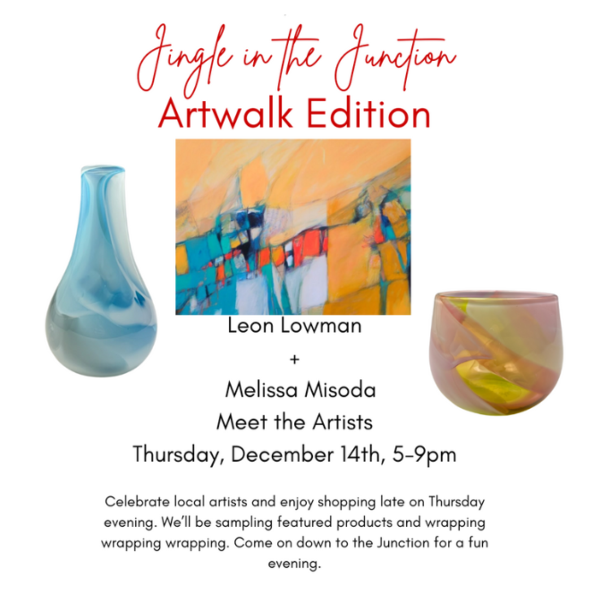 We hope you can join us tomorrow for our last Art Walk of the year. This month we're featuring the art of Leon Lowman and Melissa Misoda, and we're staying open an extra hour. The December show is always hopping. We hope to see you soon!