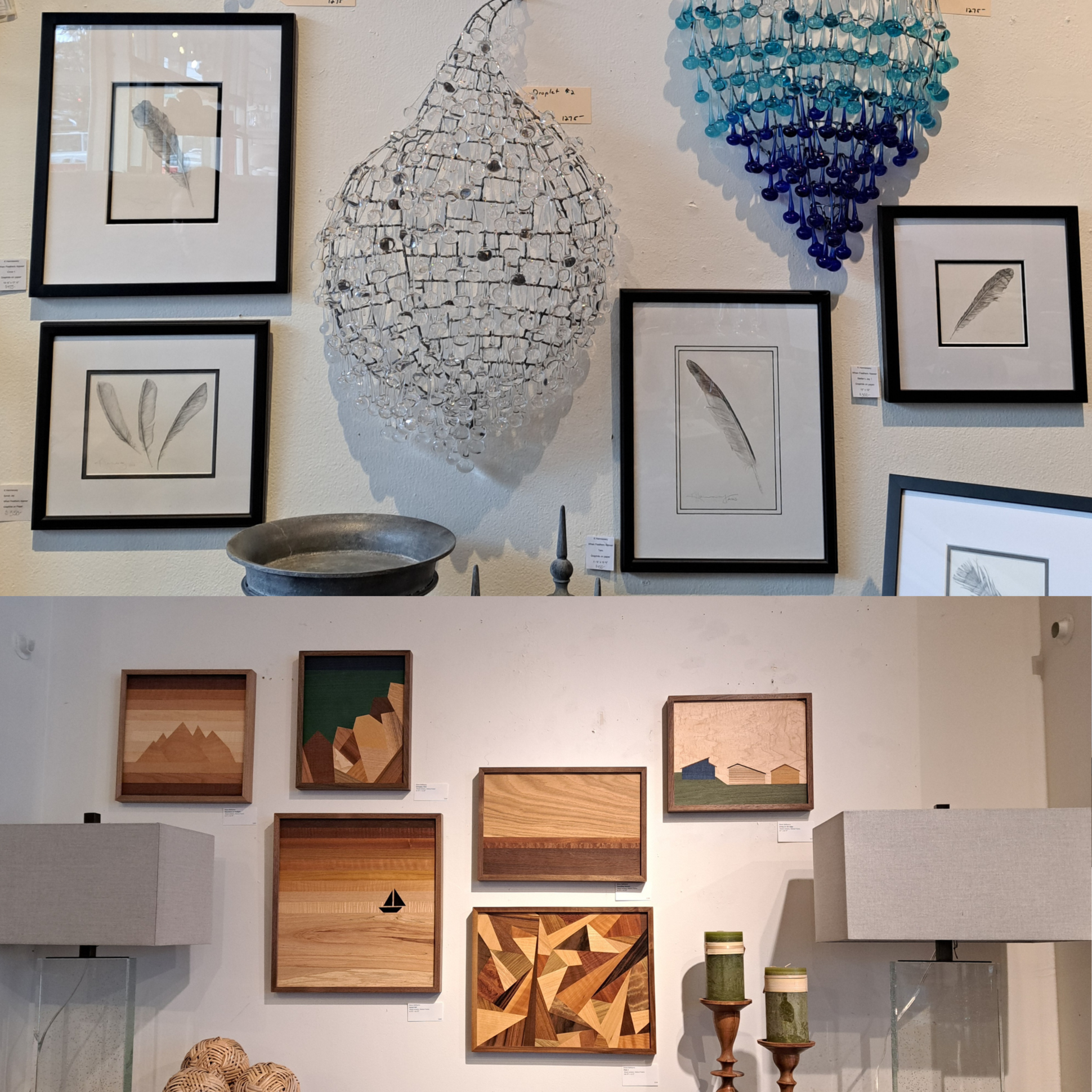 We love to see Kassie's detailed feathers in graphite, and Diane's use of color and grain in her wood veneer art. Their work will be displayed in-store all month. We hope to see you here!