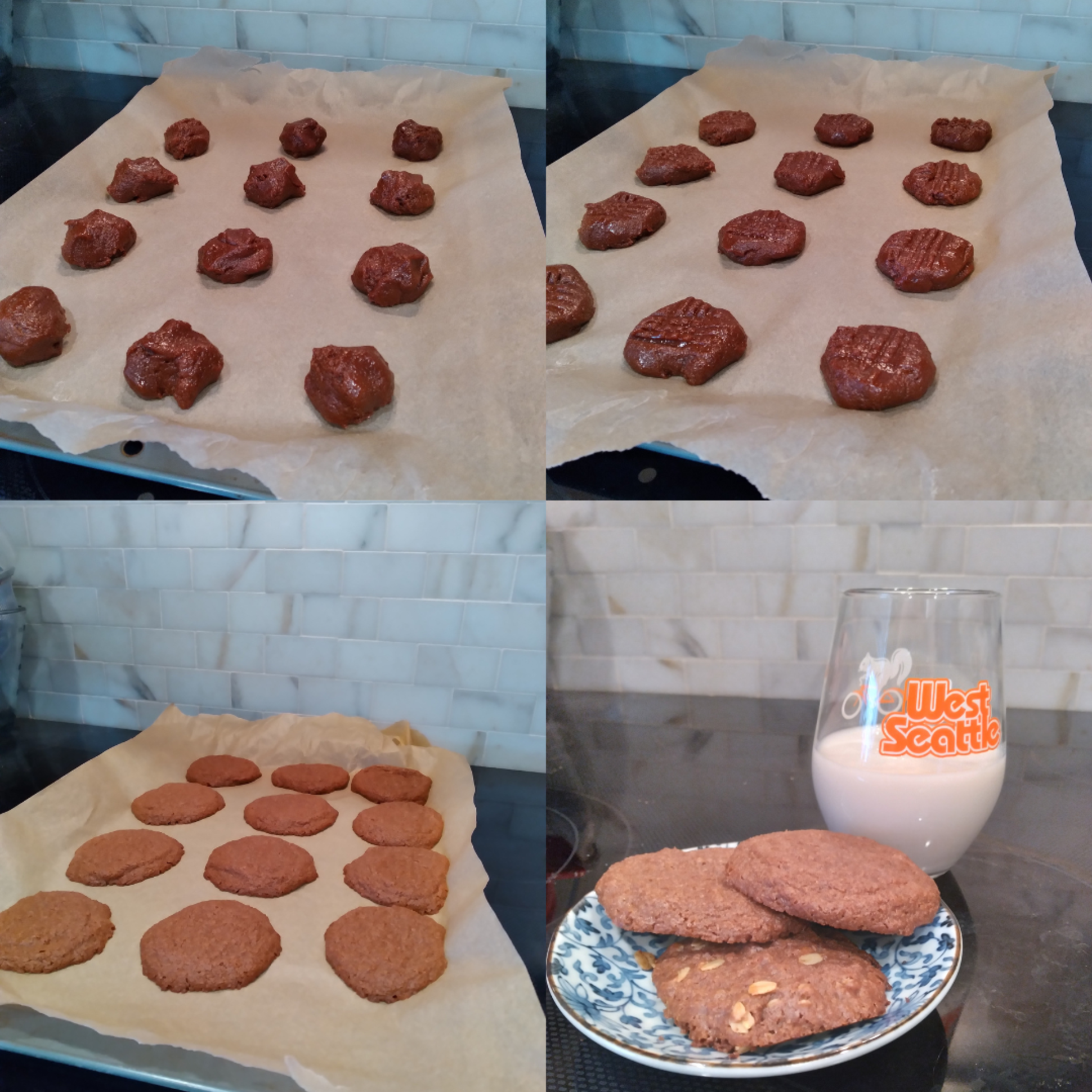 Mix together, drop spoonfuls on a baking sheet (I like to line them with parchment paper for easy clean up), flatten with the tines of a fork, or bottom of a drinking glass. Bake at 350F for 8-12 minutes (until they lose most of their shine), and cool on a rack.