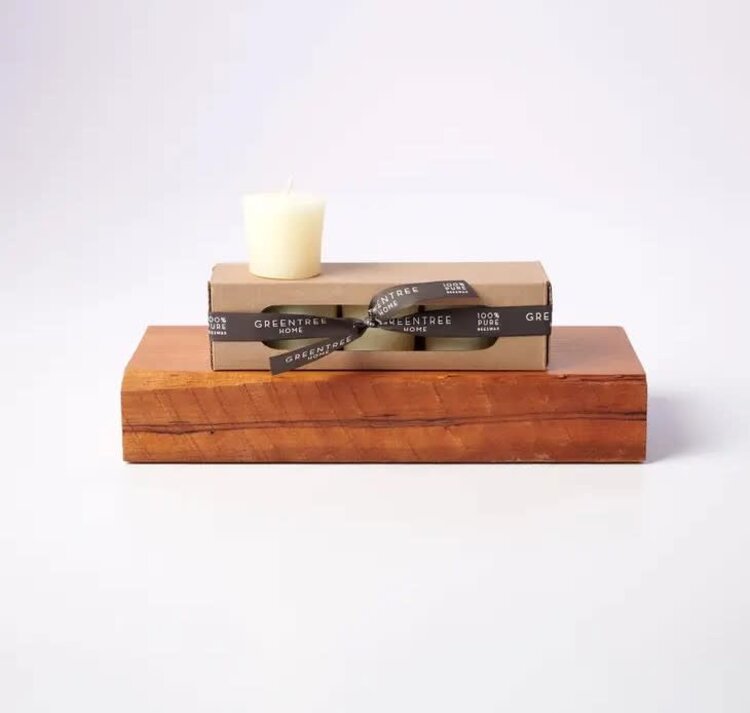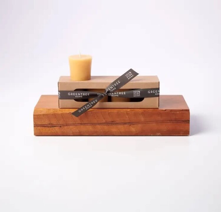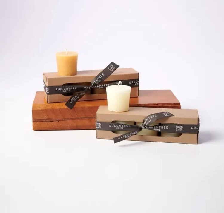 • At your next dinner party, burn pure and simple beeswax votives. Boxed in a set of 4. Available in natural or cream.