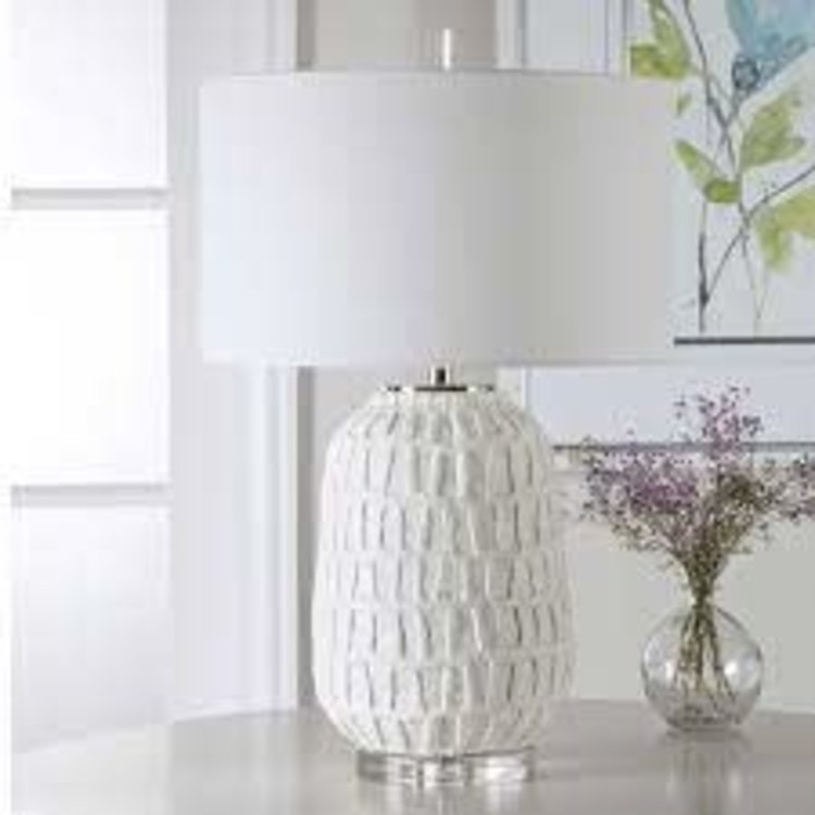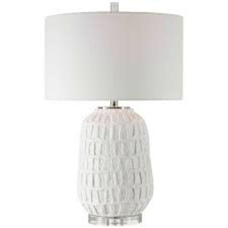A modern take on old world style, this table lamp features a textured, aged white ceramic base with an organic grid design displayed on a thick crystal foot with polished nickel accents. The lamp is paired with a white linen drum shade. *This item isn't covered by our shipping special, it is available for free pick-up in our West Seattle store. Please contact us directly if you wish to discuss possible shipping options or local delivery.