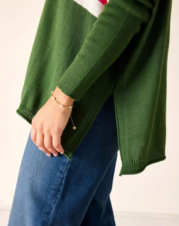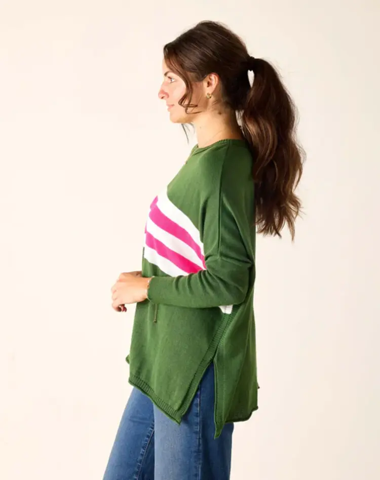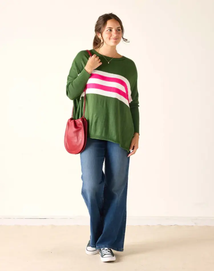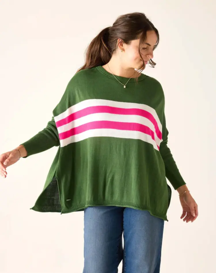 Offered in a beautiful green and lipstick triple stripe, this one-size design provides a comfortable, flattering fit that works beautifully for most shapes. Whether giving it as a cozy winter gift or a stylish everyday gift, this sweater is guaranteed to impress.