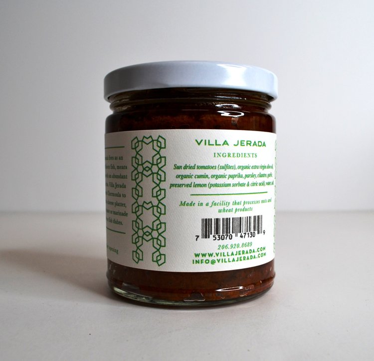 -Sun dried tomatoes (sulfites), organic extra virgin olive oil, organic cumin, organic paprika, parsley, cilantro, garlic, preserved lemon (potassium sorbate & citric acid), water, salt.