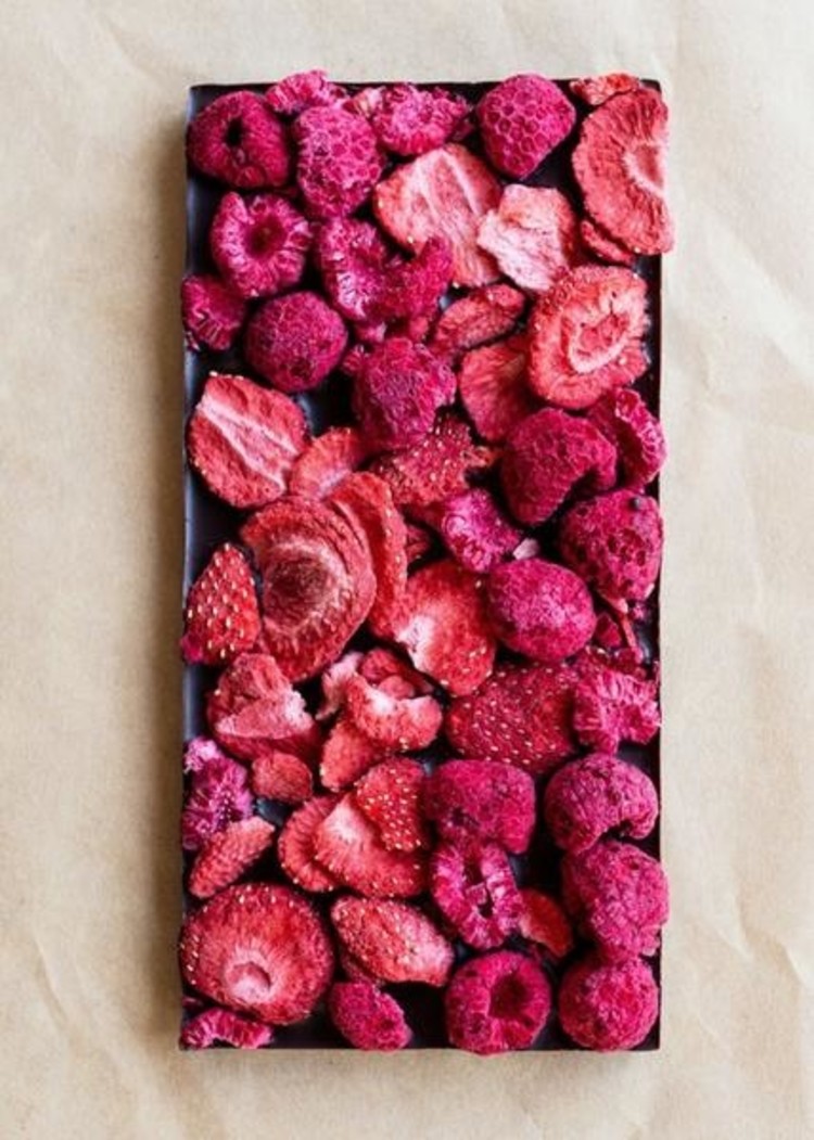 Even more striking than the beauty of this bar is the balance of its tart and natural sweetness brought forward by hand placed strawberries and raspberries on top of rich 70% dark chocolate. Enjoy on its own or with a bowl of vanilla ice cream.