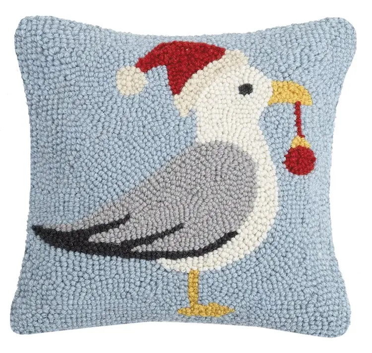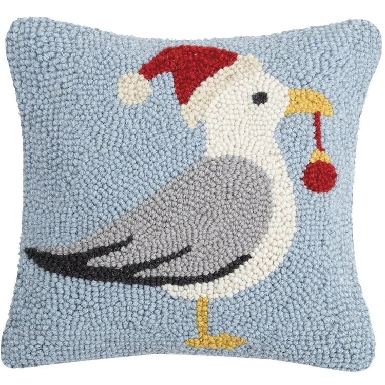 Expertly hand-hooked from 100% wool, this pillow features a cheerful seagull dressed for the Holiday Season, offering a lighthearted nod to coastal Christmas living. The 100% cotton velvet backing adds a layer of softness and luxury, making it an elegant yet fun addition to your sofa, entryway bench, or guest room.