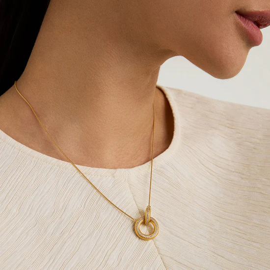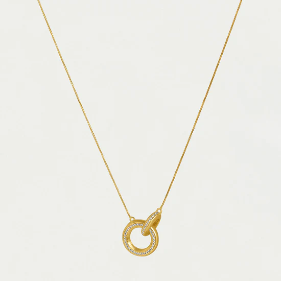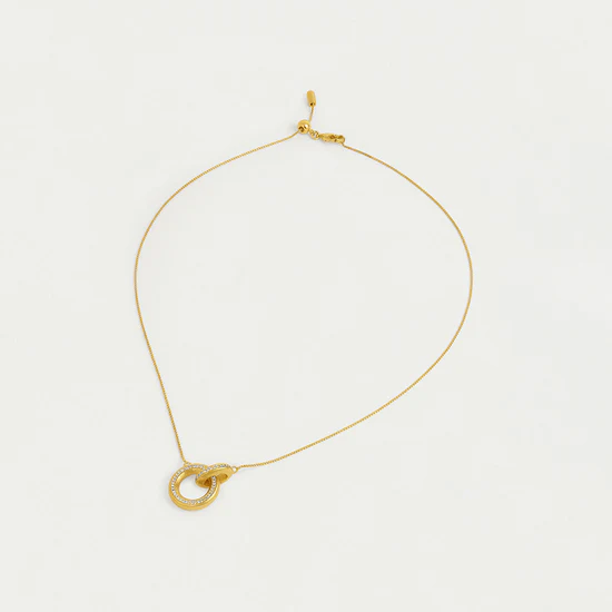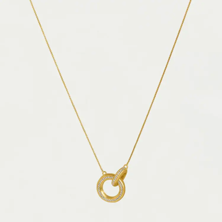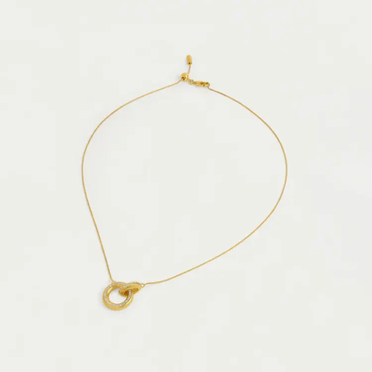 Two interconnected loops add depth to your neckline, while hand-set pavé cubic zirconia gemstones catch the light beautifully, offering subtle sparkle and sophistication.