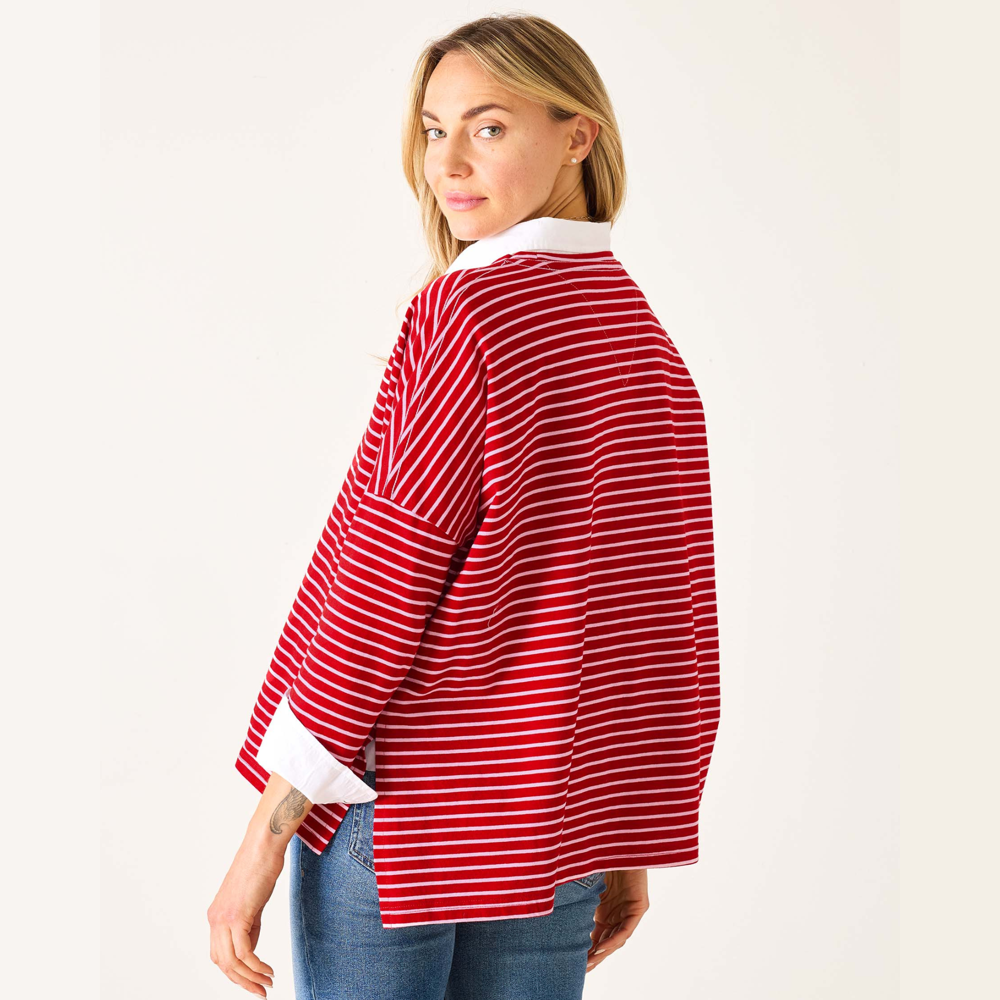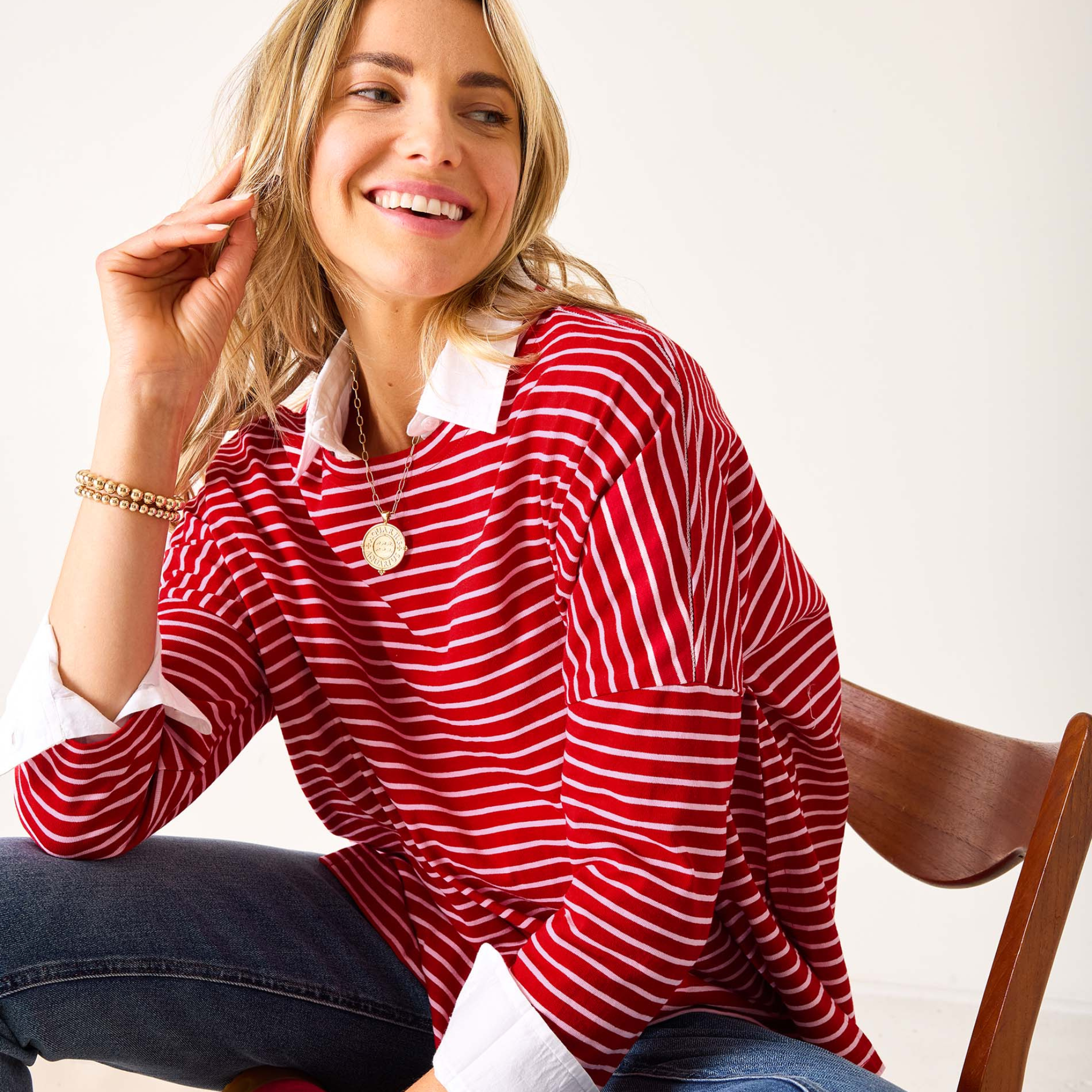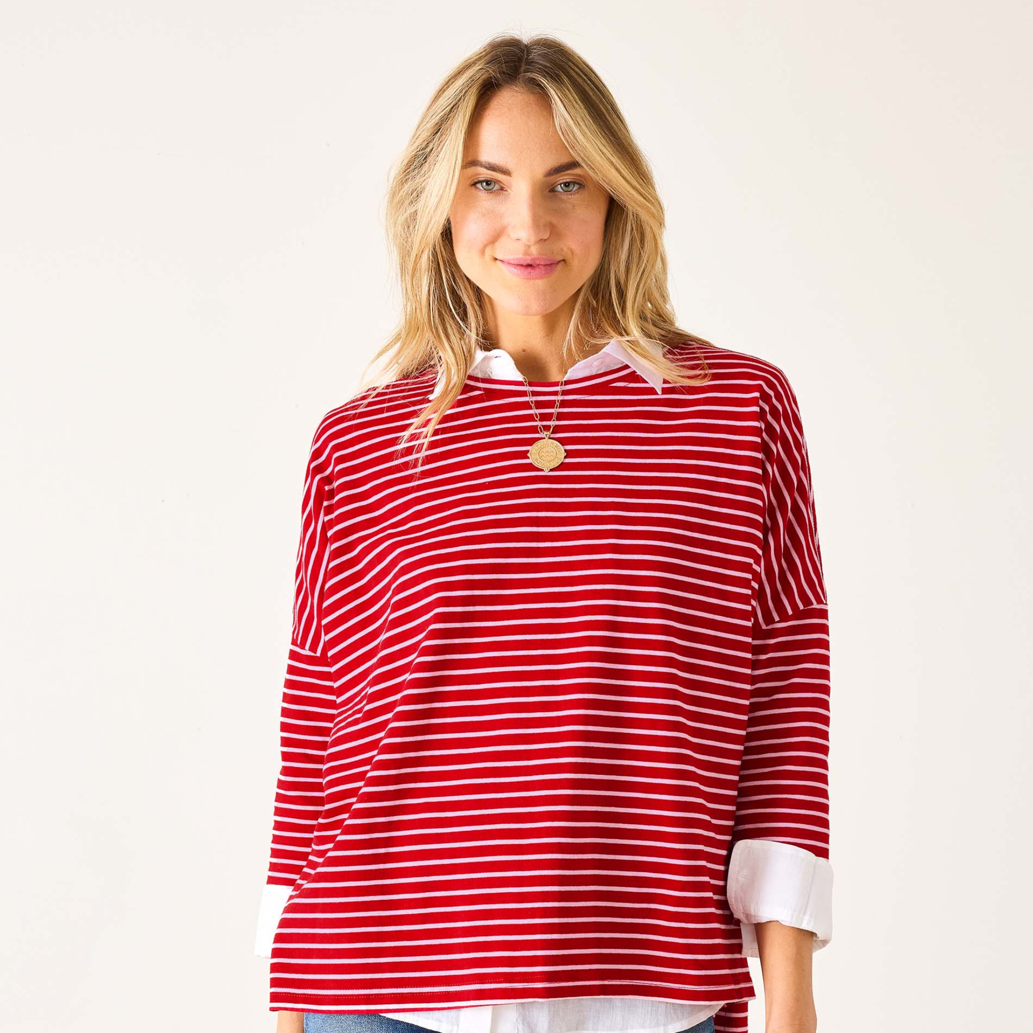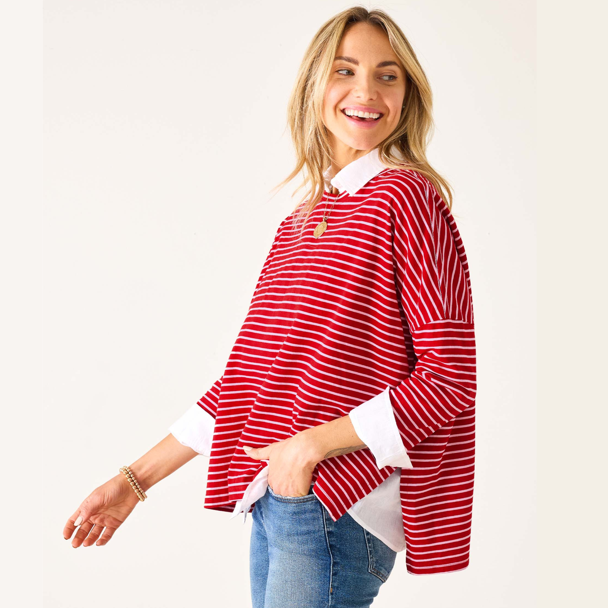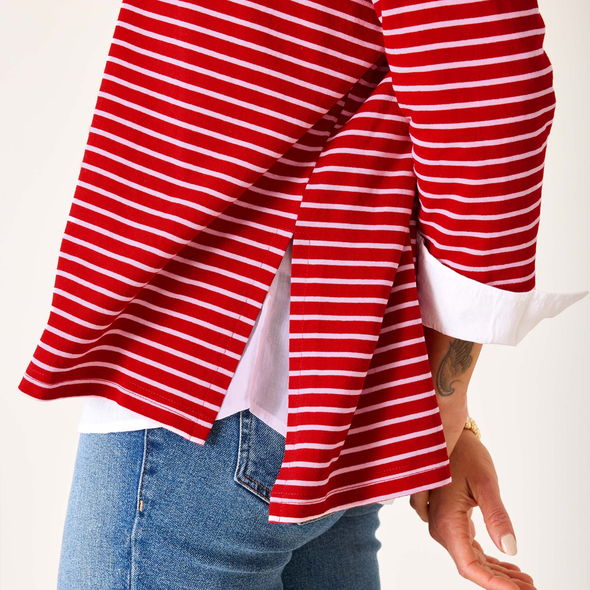 Designed for discerning women who appreciate quality and style, this lightweight slub tee features soft cotton fabric, three-quarter sleeves, and our signature side slits for a flattering drape. The dark red and pink stripes evoke the festive hues of the Holiday Season, making it a perfect gift or wardrobe staple for your winter style rotation.