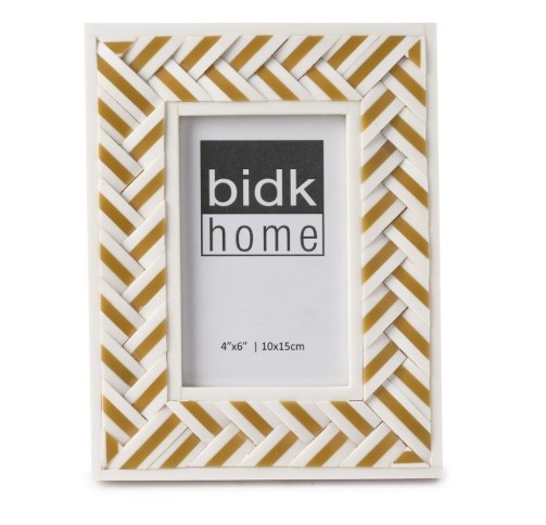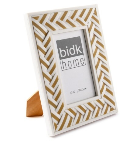 Showcase your favorite memories with the Criss Cross Frame 4x6 - Brown, a stylish piece of home decor that brings both sophistication and texture to any room. Crafted from white and gold resin, this frame features a distinctive herringbone pattern that adds visual interest while complementing modern or classic interiors.