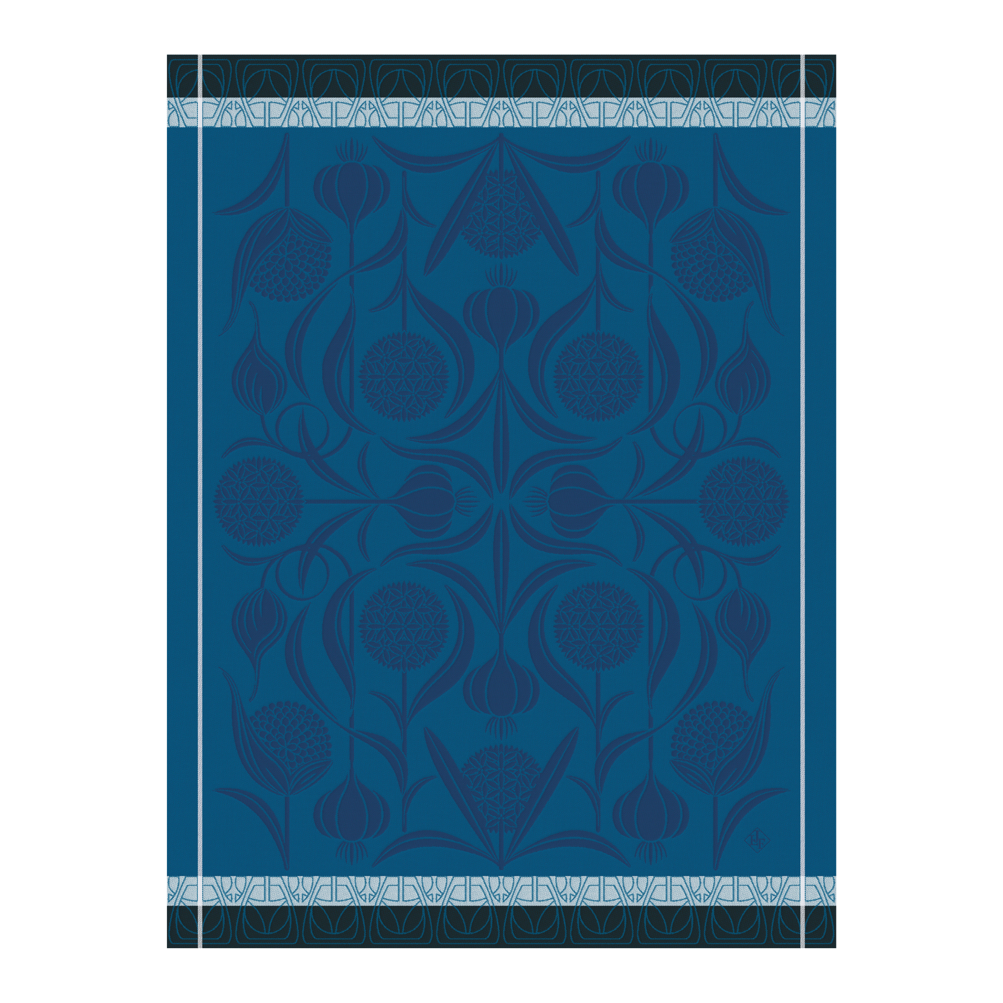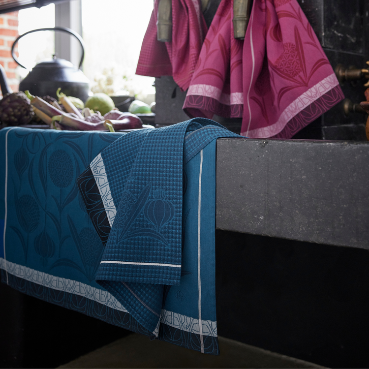 The Tea Towel l’Ail Blue is crafted from long-staple combed cotton with Jacquard weaving, finished with simple 1 cm / 0.39" hems. Its generous size of 60x80 cm and woven label make it practical for hanging in your kitchen while maintaining the luxurious quality expected from fine French table linens.