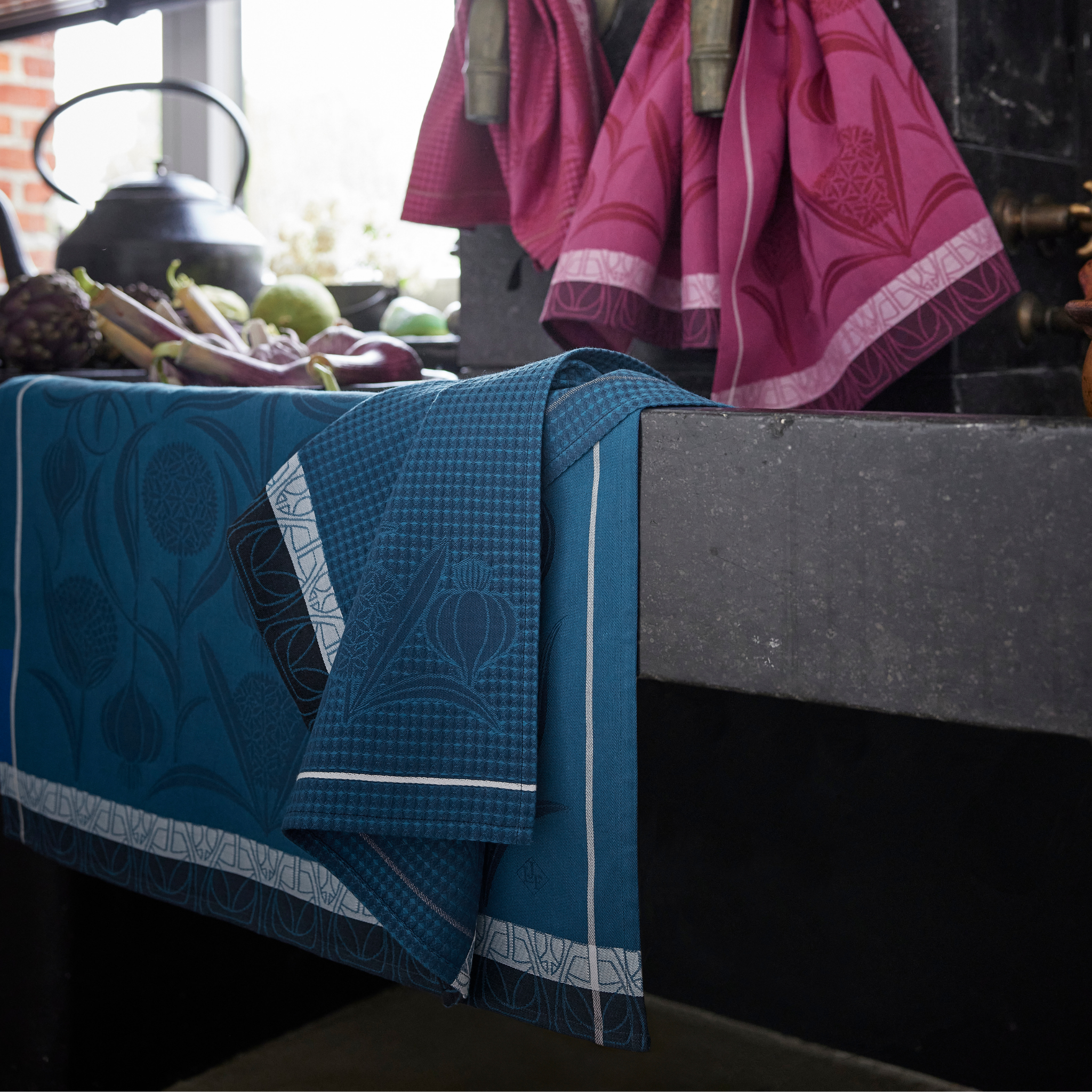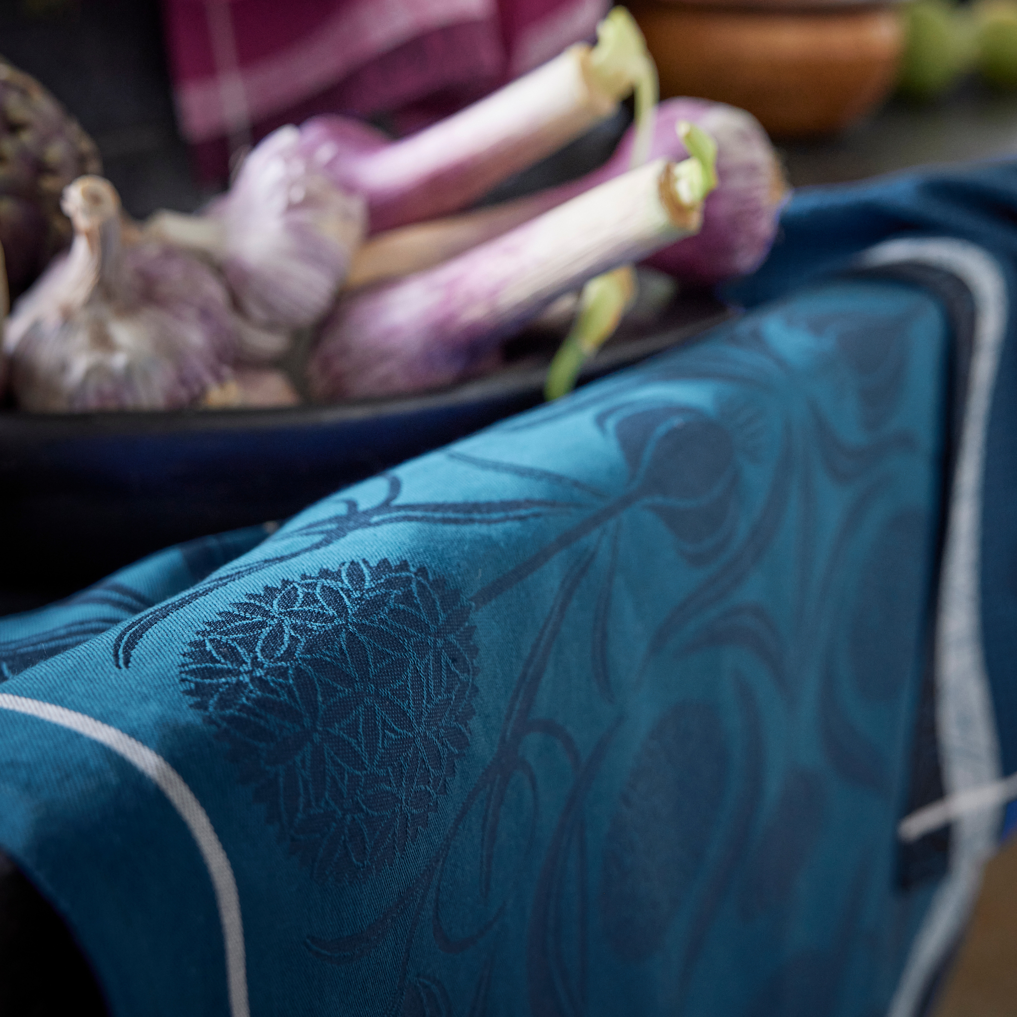 Inspired by garlic’s aromatic beauty and transformed into an art nouveau decorative motif, this tea towel embodies the elegance and refinement that define premium French table linens.