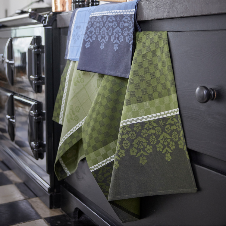 Featuring a classic weave and iconic retro floral motifs in vibrant green hues, this tea towel is both practical and decorative.
