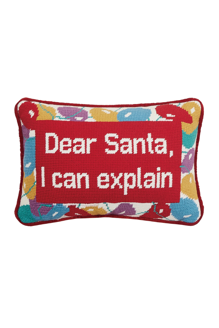 The pillow features the phrase “Dear Santa, I can explain” stitched across a rich red background, surrounded by a colorful, abstract floral pattern that exudes warmth and whimsy — perfect for livening up your living room, bedroom, or entryway during the Holiday Season.