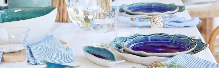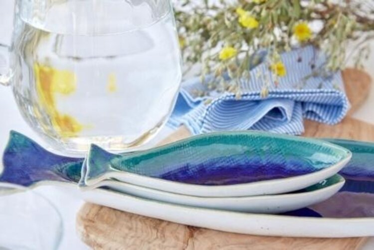 It features an appealing set of dining pieces, combined with fish-shaped serveware and appetizer items that are both functional and decorative.