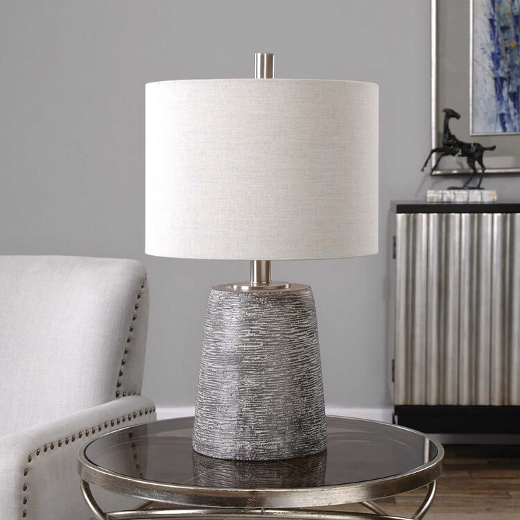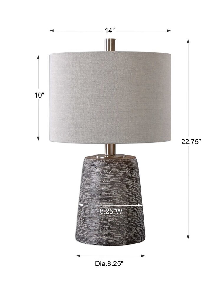 • Heavily textured, dark rustic bronze ceramic with a light gray wash accented with brushed nickel plated details. The round hardback drum shade is a beige linen fabric.