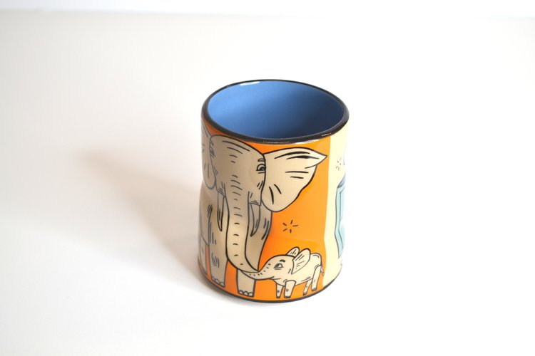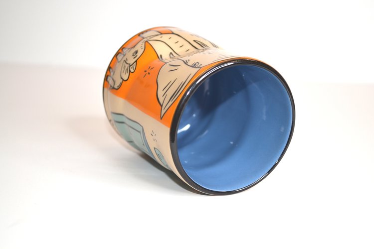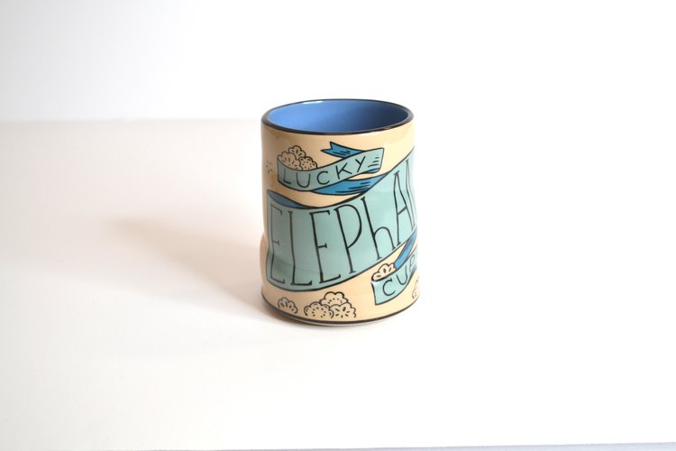 Like prints of a painting, the cups that make up the Lucky Cup Line are faithful reproductions of the artist's originals. Designed in Washington State, made in Thailand. The wares are food, microwave, and dishwasher safe, as well as family and cafe proven strong.