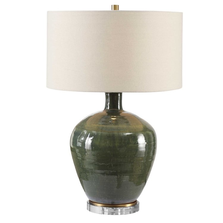• This ceramic base is finished in a distressed emerald green glaze, accented with antique brass plated details and a crystal foot.