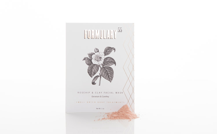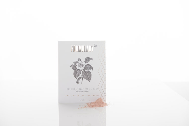 INGREDIENTS: French white and pink clay, rosehip powder, ground comfrey root, and organic rose geranium essential oil.