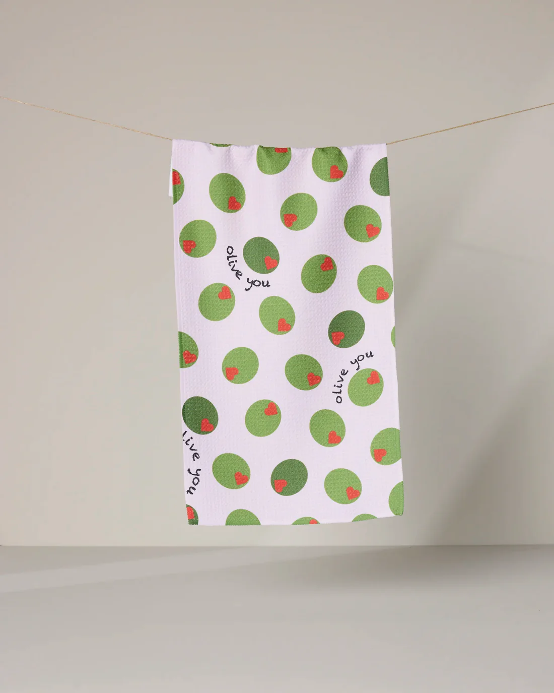 The towel features a sewn-in loop for easy hanging, and its playful "Olive You" design makes it an ideal home decor and gift for friends, family, or yourself. Made from post-consumer recycled materials and manufactured using eco-conscious methods, this towel is as kind to the environment as it is to your kitchen.