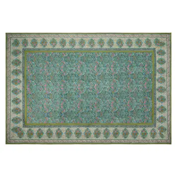 Delicate vines trail across a soft celadon ground, dotted with blush pink blossoms, summer birds, and tender green leaves—like a painter’s canvas brought to life. Intricate borders frame the design with rhythmic florals and graceful arches, evoking the romance of old-world textiles and storied countryside estates. This layered, timeless aesthetic makes it a standout piece in any home decor collection and a meaningful choice for gifting.