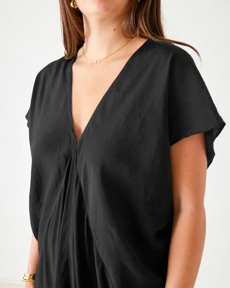 - Deep V-neckline and relaxed short sleeves