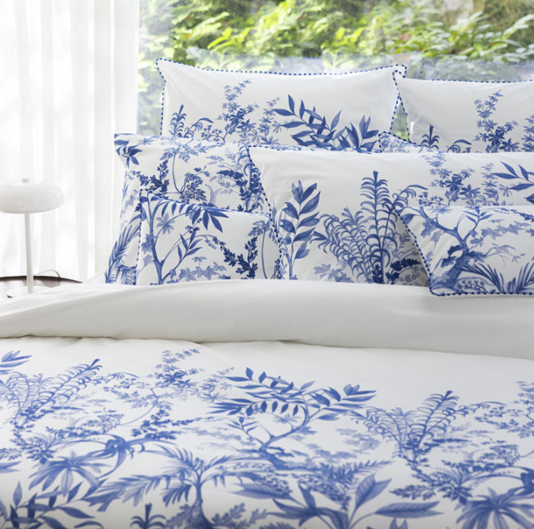 Somewhere in Europe, where the sky is a deep blue, this set is a life-size journey to the heart of a lush garden. Inspired by panoramic paintings, ivy, capillary, calathea, hosta and so many other species harmonise to create a garden paradise. The cotton percale pillowcases are accented with a delicate braid.- Fancy cotton braid- Combed yarns (long fibres),- Printed cotton percale,- Front: 122 threads/cm² - Back: 80 threads/cm²