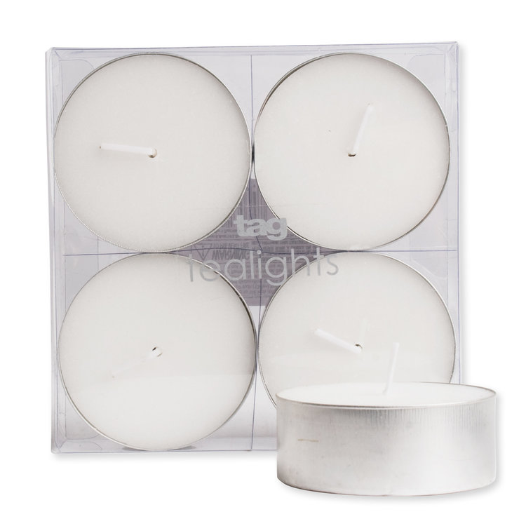 Jumbo tealight candles in classic white, each is housed in a metal cup.