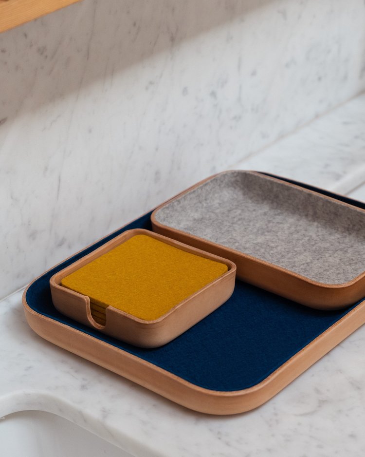 Sculpted leather and merino wool combine forces to create a soft landing for the little things you need close.