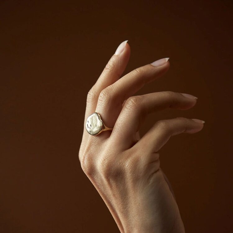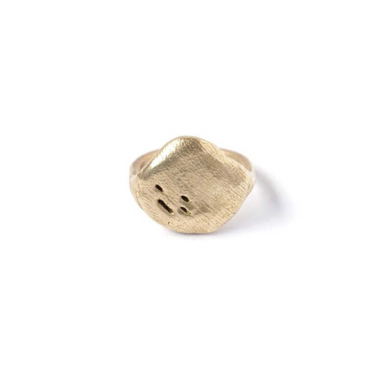 Featuring local West Seattle artist Rebekah J. The shield-like design of this ring reminds her of the loyalty she owes herself, inspired by the support of family and friends who shield and uplift her. Hand-carved and lost wax cast in brass.