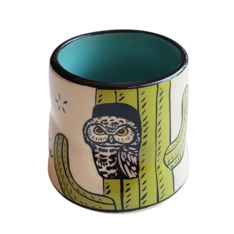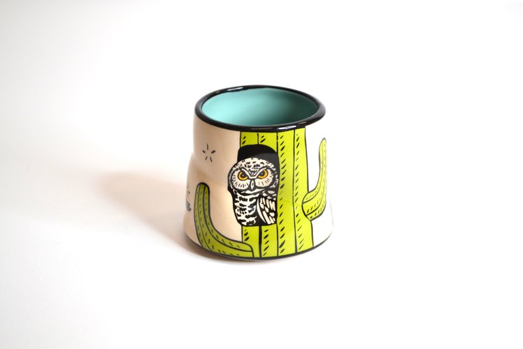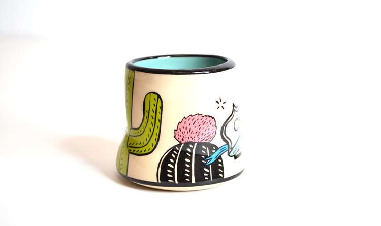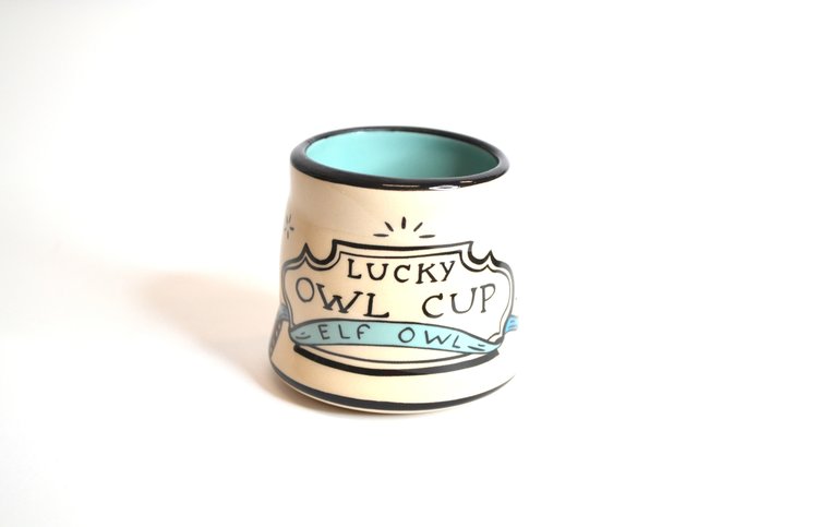 Like prints of a painting, the cups that make up the Lucky Cup Line are faithful reproductions of the artist's originals. Designed in Washington State, made in Thailand. The wares are food, microwave, and dishwasher safe, as well as family and cafe proven strong.