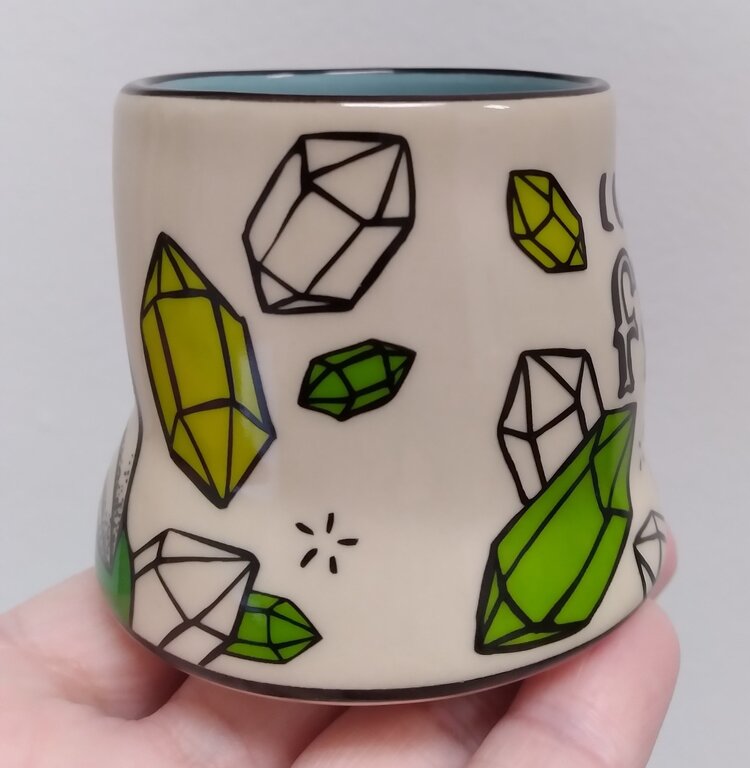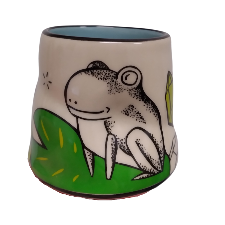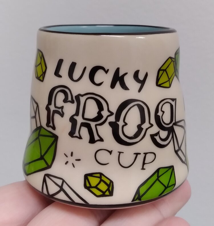 Like prints of a painting, the cups that make up the Lucky Cup Line are faithful reproductions of the artist's originals. Designed in Washington State, made in Thailand. This is a very small cup. Please notice the height below. The wares are food, microwave, and dishwasher safe, as well as family and cafe proven strong.