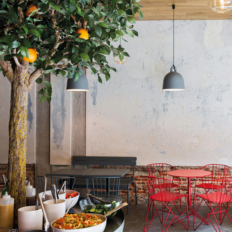 The curved aluminum slats make this bench a comfortable seat while the minimal design allows for versatility. This bench pairs excellently with the 56" x 32” and 65" x 39” Luxembourg tables, and it also makes a beautiful statement on its own.