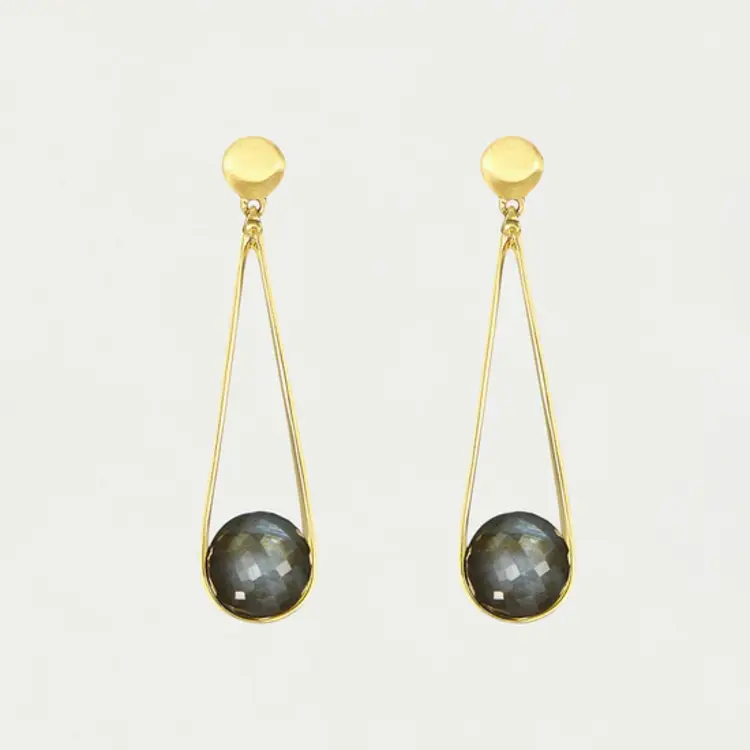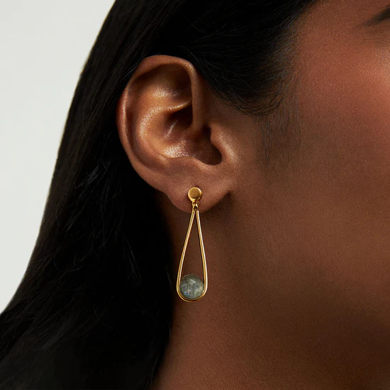 Featuring ethically sourced semi-precious Labradorite, each piece is hand-cut to give a unique color and sparkle, perfect for adding a touch of glamour to everyday outfits.