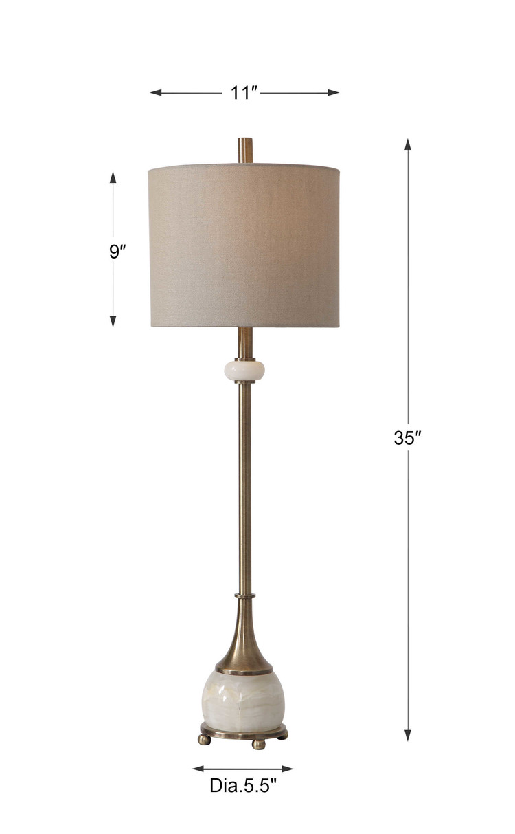 • This buffet lamp features a delicate design with traditional elements that showcase polished white marble details, paired with antique brass plated accents.