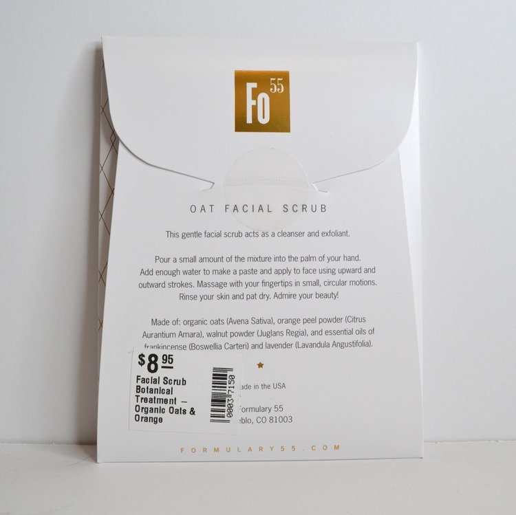 INGREDIENTS: organic oats (Avena Sativa), orange peel powder (CitrusAurantium Amara), walnut powder (Juglans Regia), and essential oils offrankincense (Boswellia Carteri) and lavender (Lavandula Angustifolia).