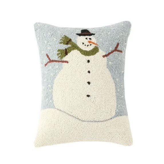 This Holiday Season accent pillow features a smiling snowman wearing a classic black hat and a green scarf, set against a soft blue background sprinkled with white snowflakes. Each pillow is meticulously hand-hooked with New Zealand wool yarn, offering rich texture, vibrant color, and artisanal quality that will last for many holiday seasons to come.