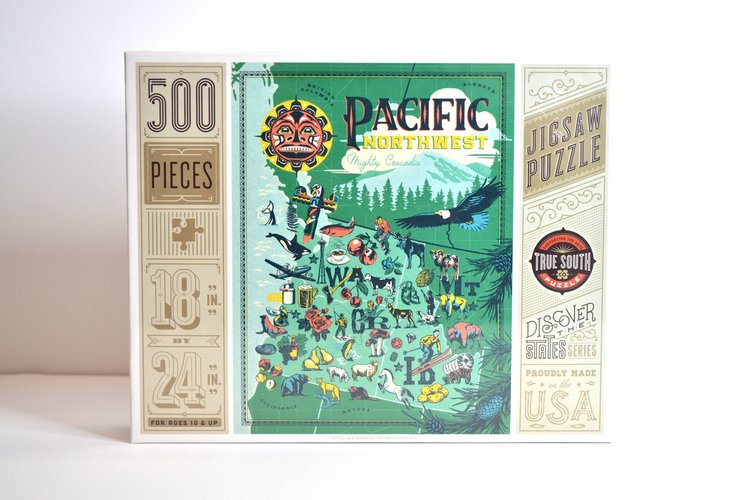 Known as much for its unique food and culture as it is for its majestic natural beauty, the northwest corner of the United States, spanning from the Pacific coastlines of Oregon and Washington to the Continental Divide in western Montana, is waiting to offer adventure. So the next time you find yourself tucked inside on a rainy day, let this puzzle by artist Ligia Teodosiu inspire you to explore all Cascadia has to offer.