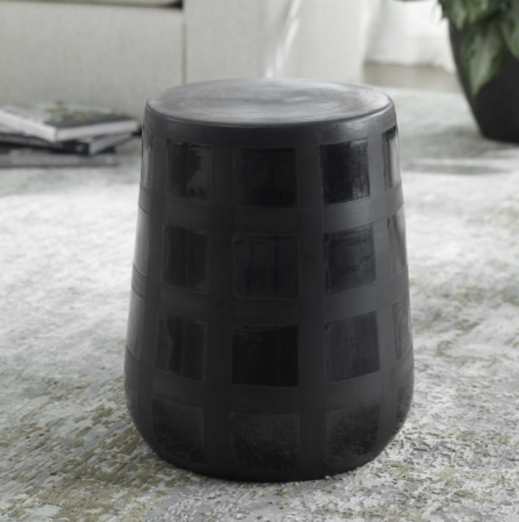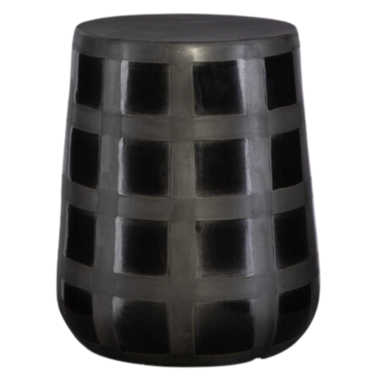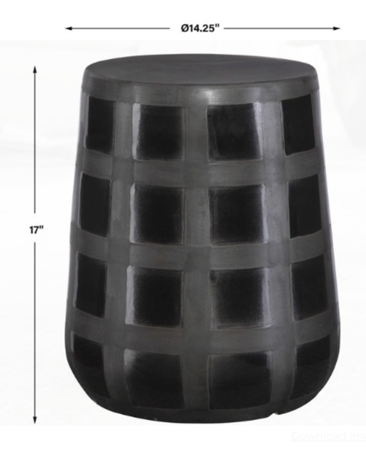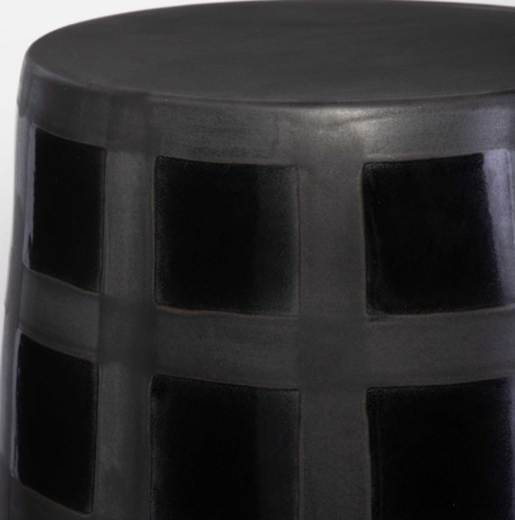 Modern and multifunctional, this ceramic garden stool features a gridded two tone effect created by gloss and matte black glazes. May be used outdoors, but protection from freezing temperatures is recommended.