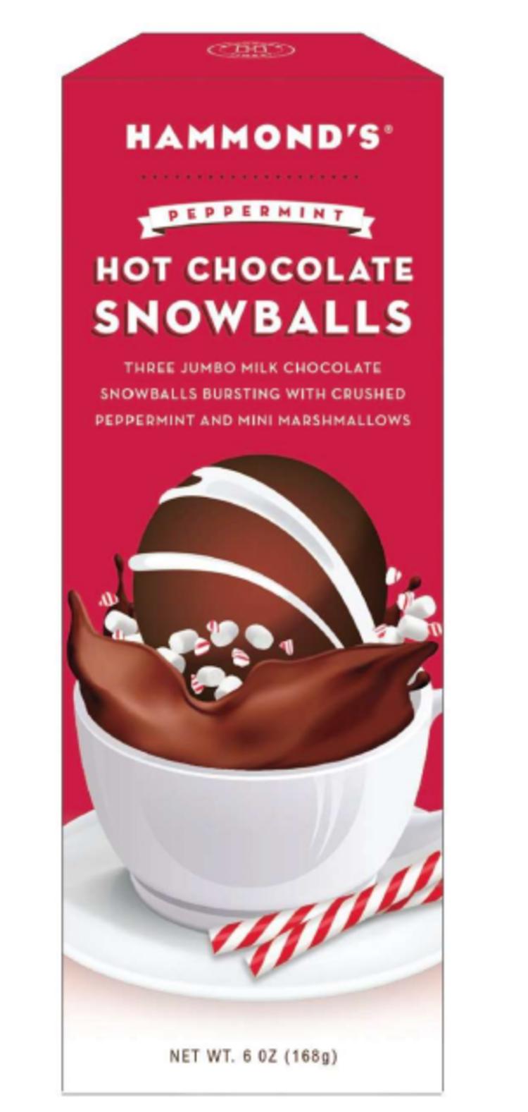 Please note: Hammond's Hot Chocolate Snowballs are handmade and the size, picture, and shape may vary. Manufactured in a facility that processes egg, milk, mustard, peanuts, sesame, soy, sulfites, tree nuts, and wheat.