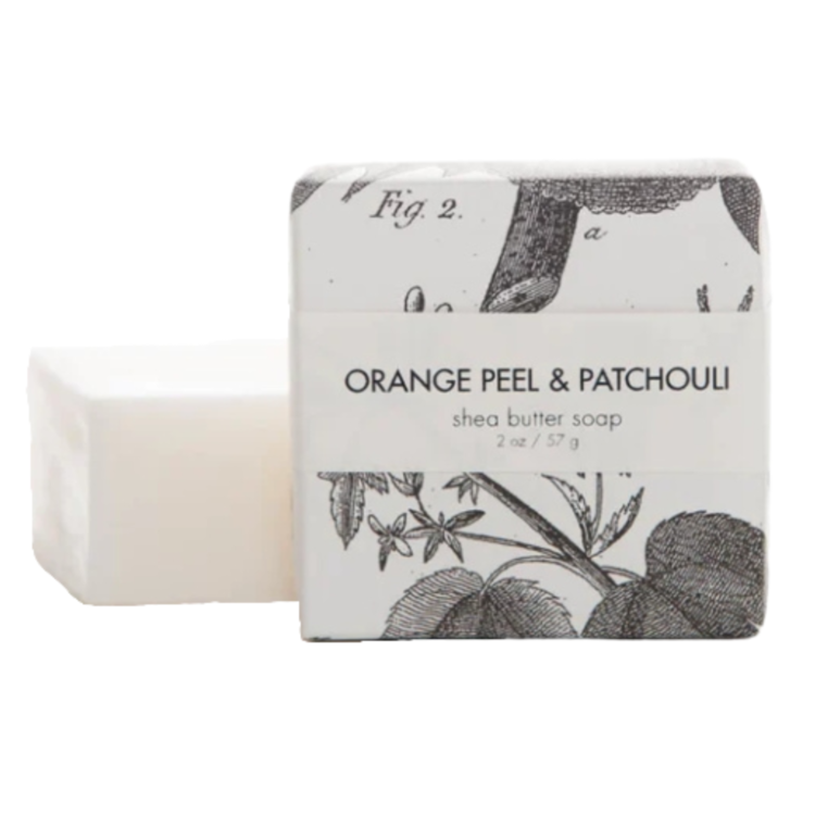 -2 oz. Orange Peel & Patchouli shea butter soap packaged in our signature botanical and vintage illustrations.