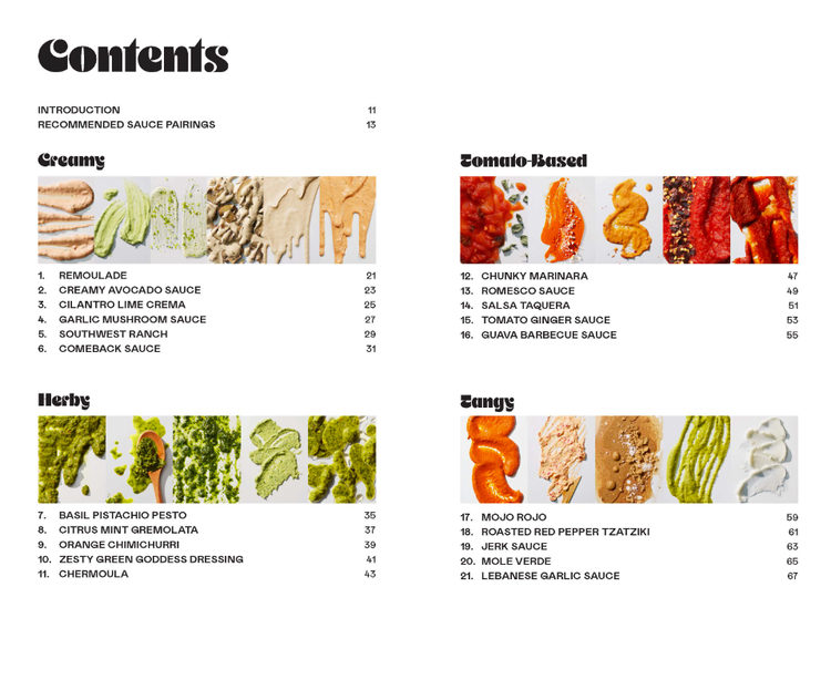 How-to instructions for ten homemade dishes, like sautéed shrimp, juicy burgers, and fluffy pancakes, and a handy list of recommended sauce pairings for a range of proteins, vegetables, pasta, beans, grains, and greens, help you get your saucy party started.