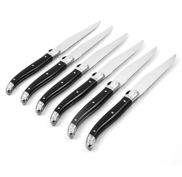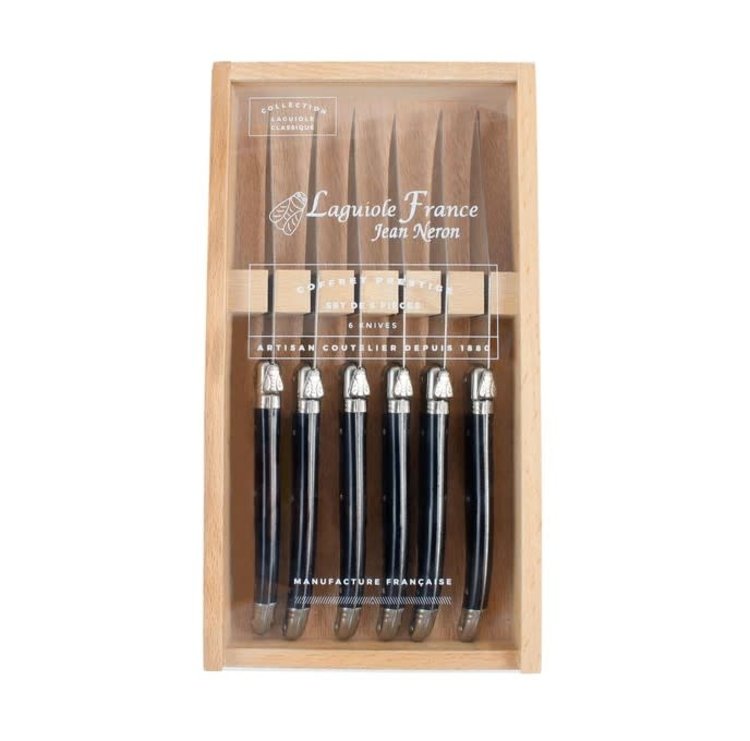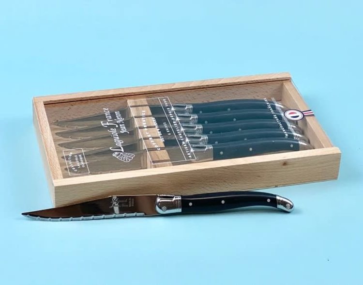 Stainless steel with acrylic handle. Iconic Laguiole bee motif at top of handle. Cutlery sets manufactured in France.
