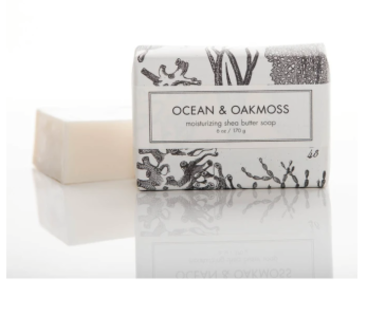 6+oz. Ocean & Oakmoss shea butter bath bar packaged in signature botanical and vintage illustrations.